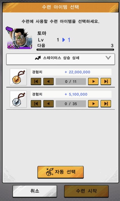 캐릭터를 선택하여 수련 아이템을 사용하면 레벨을 올릴 수 있습니다!