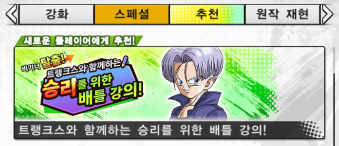 '트랭크스와 함께하는 승리를 위한 배틀 강의!'의 첫 회는 스토리 1부 2장 6화 NORMAL을 클리어한 후 메인 화면에서 자동적으로 등장합니다.